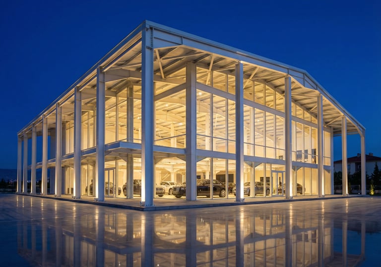 Özellikle alışveriş merkezleri, lojistik depolar, üretim tesisleri veya otomotiv galerileri gibi ticari yapılarda, iç mekanın verimliliği hayati önem taşır. Sunduğumuz geniş açıklıklı ve kolonsuz çelik sistemler sayesinde, mekanın ortasında istenmeyen taşıyıcı engeller bulunmaz. Bu sayede bir süpermarkette raf düzeni kesintisiz devam eder, bir spor kompleksinde oyun alanı bölünmez veya bir galerideki araçlar müşteriye en ferah şekilde sunulur. İşletmeniz, mekanın her metrekaresini ticari bir değere dönüştürür.